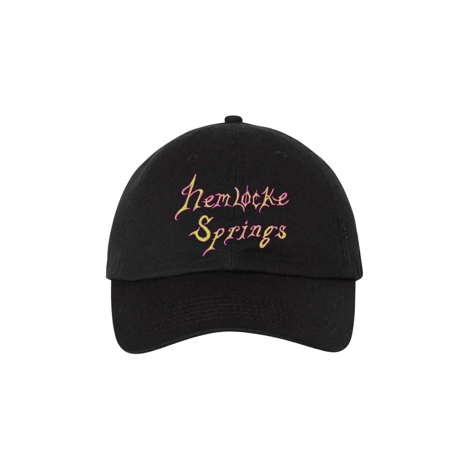 Black hat with "hemlocke springs" on front.